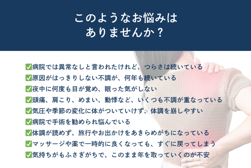 などが原因でご自身で自然に治ろうとするからだの働きが失われてしまっているからなのです。